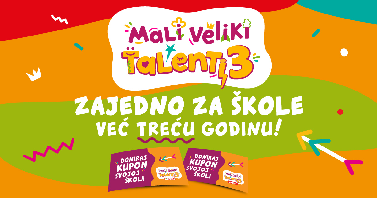 Od 3.9. do 11.11.2025. za svakih potrošenih 10 eura i/ili za kupnju odabranih proizvoda u svim Konzum prodavaonicama dobivate JEDAN kupon Mali veliki talenti 3.