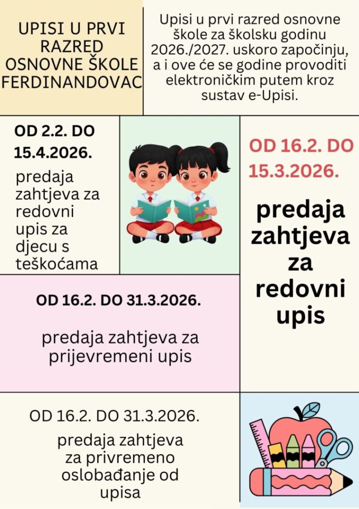 Dragi roditelji i staratelji, obavještavamo vas da započinju upisi u prvi razred Osnovne škole Ferdinandovac.