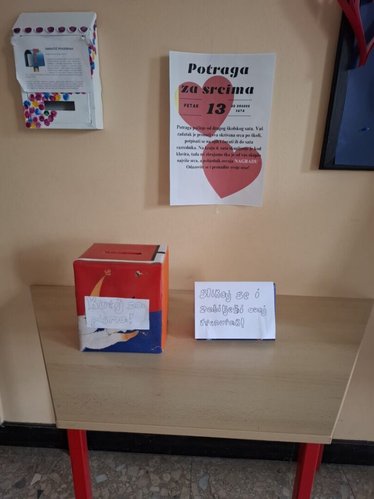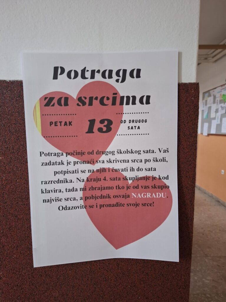 Dan zaljubljenih ove je godine u našoj školi obilježen nizom aktivnosti predvođenih učenicima Literarno-novinarske skupine „Lastavica“. Učenici su izradili srca s prigodnim porukama i 13. veljače organizirali potragu za njima. Zadatak je bio pronaći što više crvenih srca koju su bila sakrivena po školi. Učenici su s velikim uzbuđenjem sudjelovali u potrazi. Pobjednik je bio Rafael Begović, učenik osmog razreda, koji je za nagradu dobio veliku čokoladu. Polaznice skupine izradile su prigodan okvir za fotografiranje Kiss cam u kojem su se učenici fotografirali. Organiziran je i Valentinovski poštar. Učenici su mogli ostaviti pisma svojim simpatijama u kutiji punoj ljubavi koja su novinarke uručile primateljima. Obilježavanje Valentinova na poseban način nizom aktivnosti pokazalo je zajedništvo i pozitivnu energiju svih učenika.